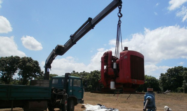 Grue, sur camion porteur, soulevant un Moteur d’entrainement de pompe d’essai